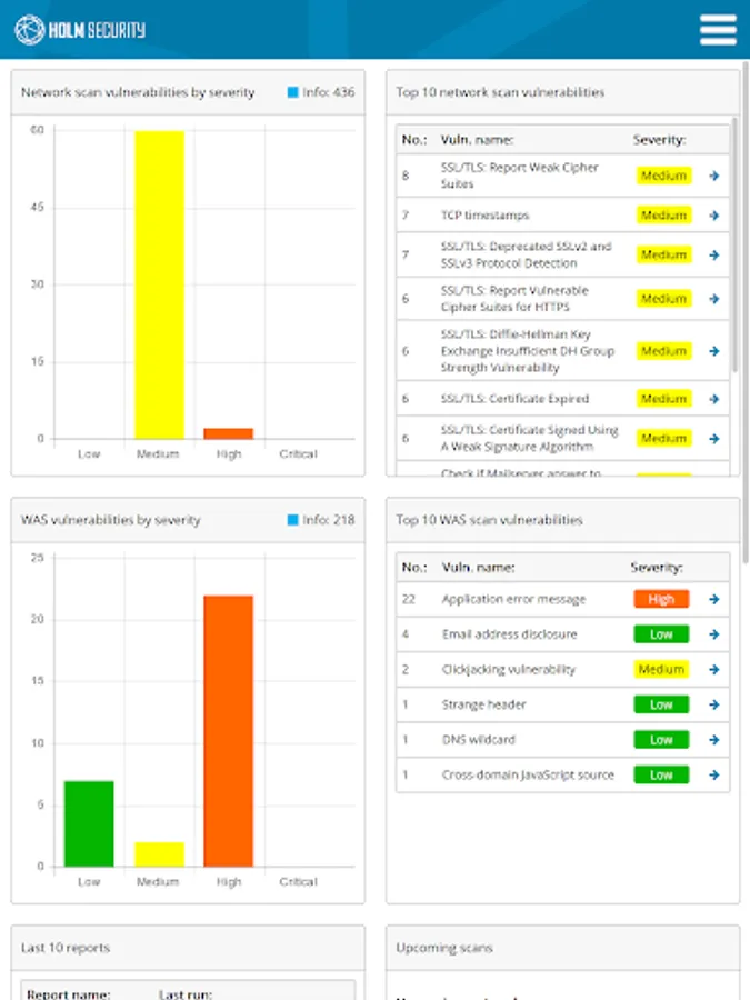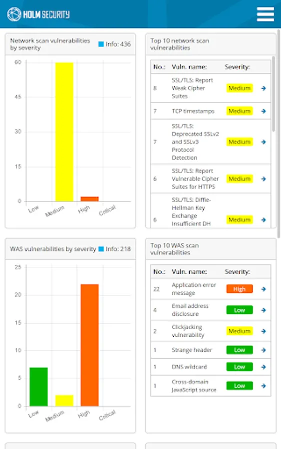 Holm Security app provides easy access vulnerability information from Holm Security VMP (Vulnerability Management Platform). The app is a customizable dashboard that provides a quick overview of current vulnerabilities, last scans, future scans, recent reports and more.