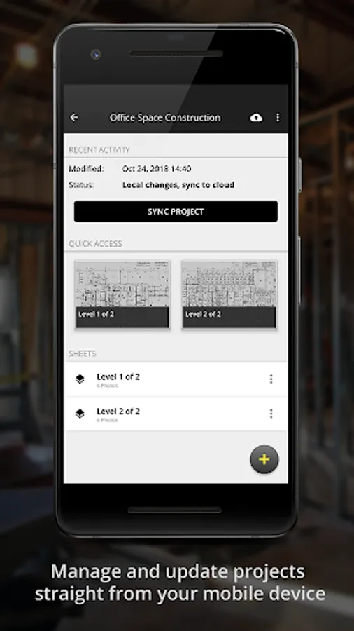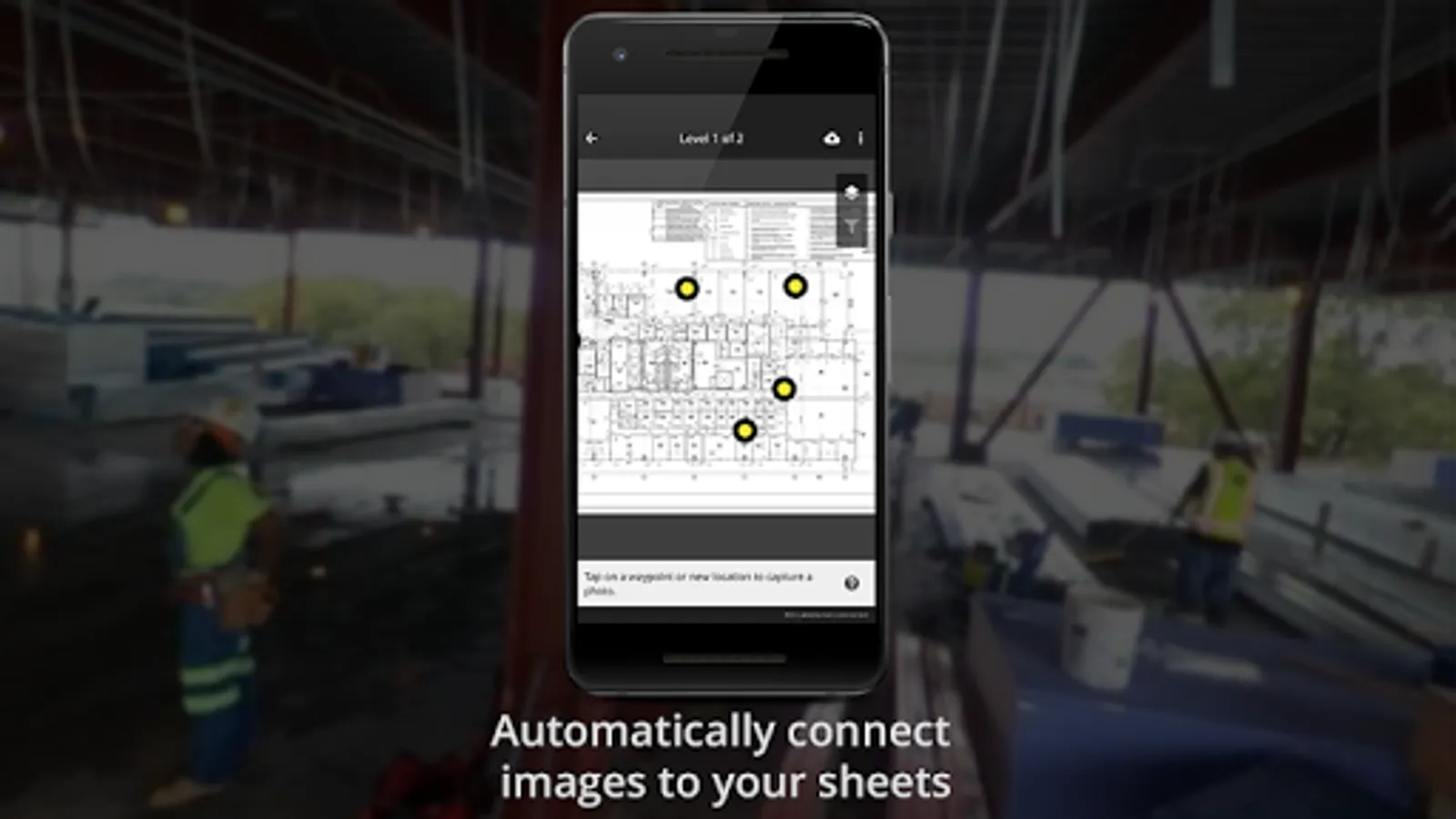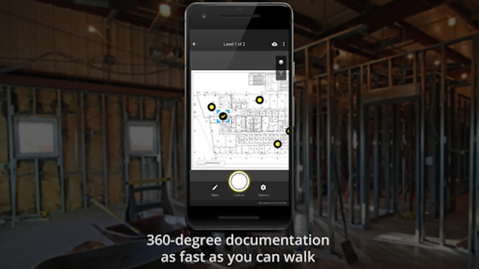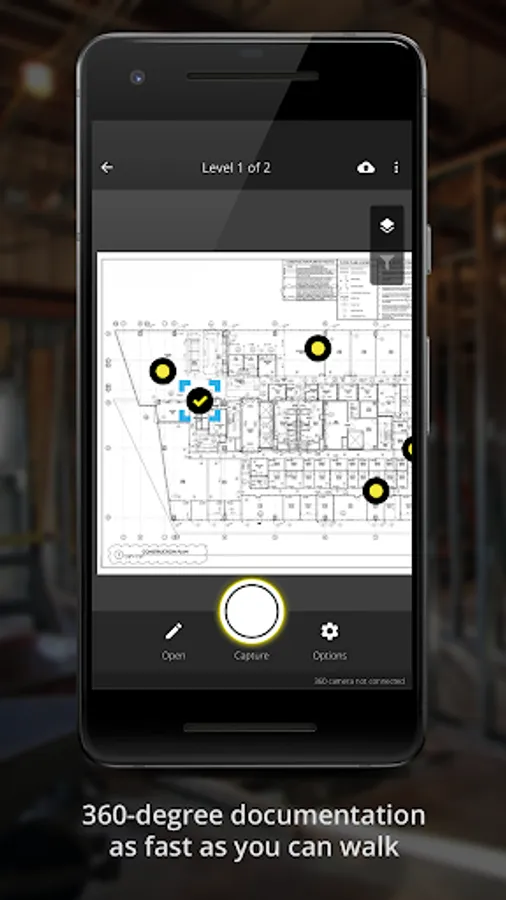 3. Tap the desired image location on the sheet and then tap the capture button to take a 360° image. Images are automatically timestamped and linked to the location on the floor plan. Repeat this process throughout your jobsite to capture the entire project then sync your project to your account.