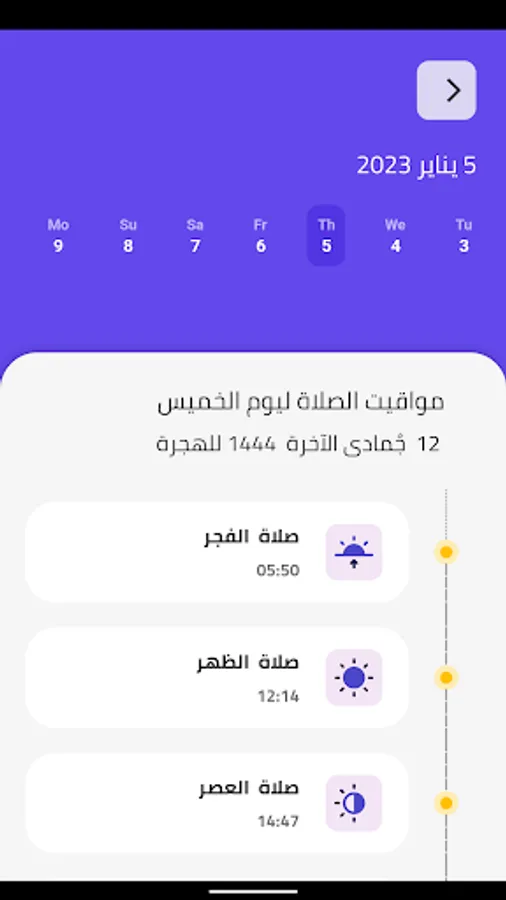 يعرض التطبيق مواقيت الصلاة الأسبوعية