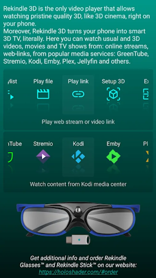 Rekindle 3D plays videos, movies and TV-shows from local files, online streams, GreenTube (YouTube alternative), Plex, Stremio, Kodi, Emby, Jellyfin media services