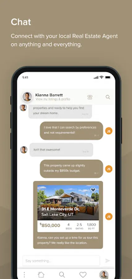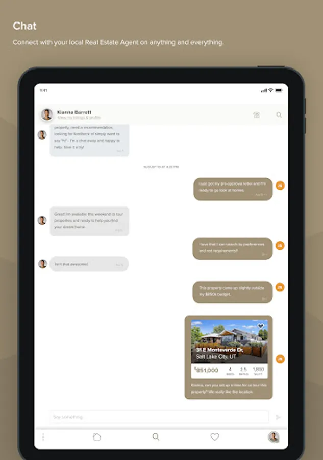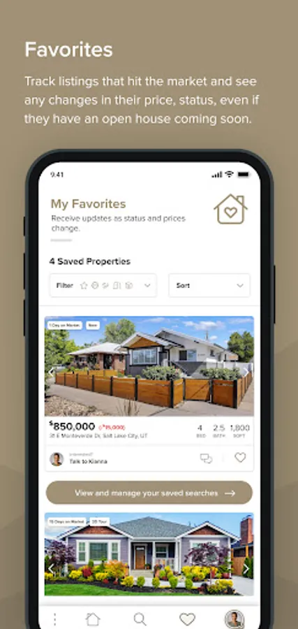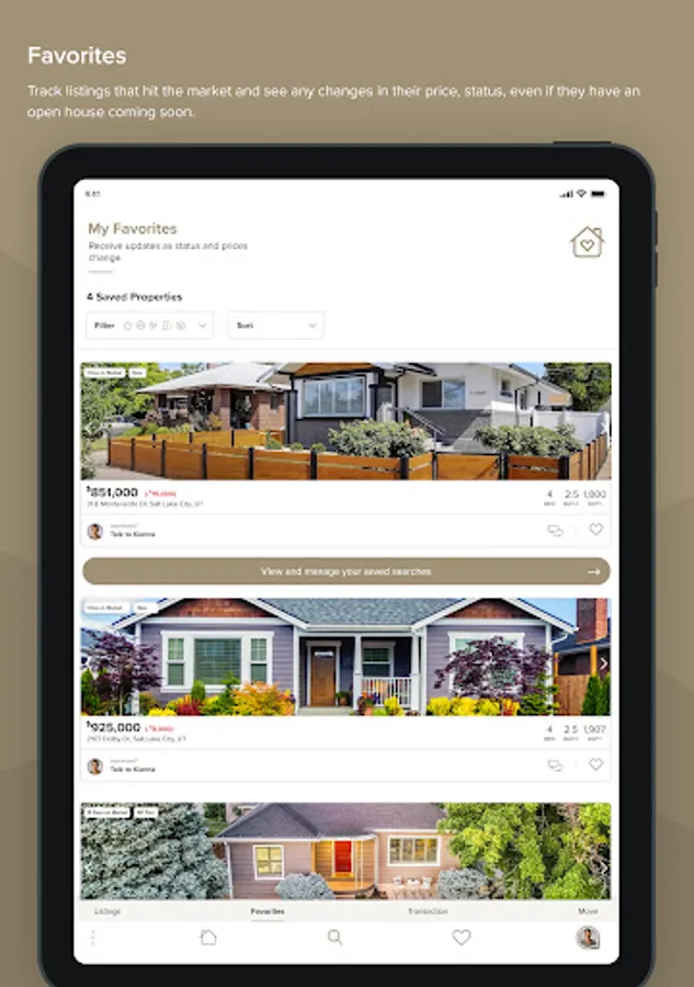 My Favorites: View saved searches and suggested homes with ease and connect with your agent for any questions.