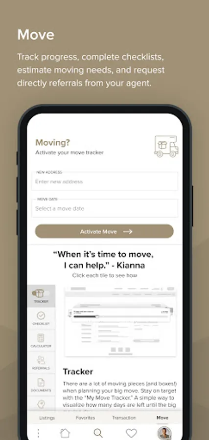 My Move: View move progress, estimate moving needs, complete checklists, and receive service referrals or second opinions from your agent.