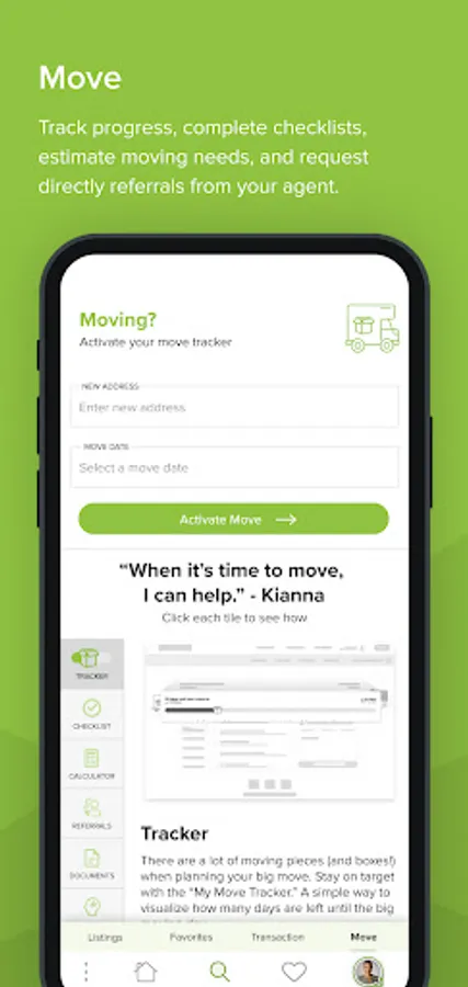 My Move: View move progress, estimate moving needs, complete checklists, and receive service referrals or second opinions from your agent.