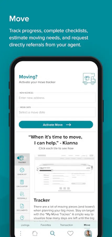 My Move: View move progress, estimate moving needs, complete checklists, and receive service referrals or second opinions from your agent.