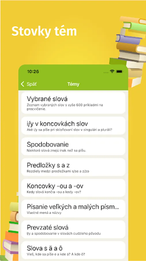 App will help you to navigate through Slovak language, practice it, prepare for school exams or just improve your skills.
