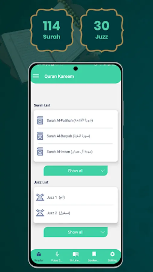 Just start the Al Quran Sharif application and select any of the Juz you want to recite from Al Quran Sharif. This Quran reader is providing you with fast and easy access to any Juz from Quran Kareem.