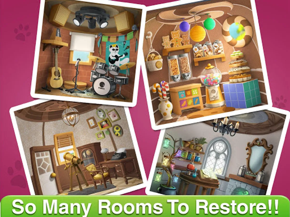 • Earn bonus rewards when you complete restoring, renovating, creating, designing & decorating cat cuties home, room, mansion, house.
