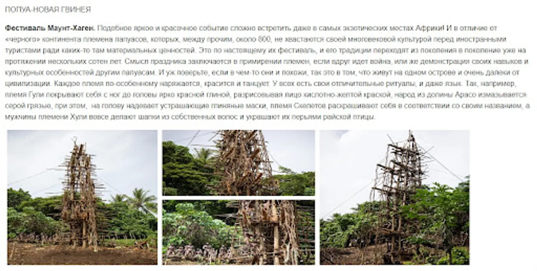 И в отличие от «черного» континента племена папуасов, которых, между прочим, около 800, не хвастаются своей многовековой культурой перед иностранными туристами ради каких-то там материальных ценностей.