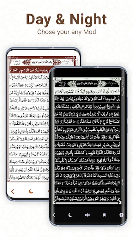 Holy Quran Sharif has different modes are to be set for the day and night timings Holy Quran Pak offline app. القران الكريم to avoid pinching light in the eyes select night mode that is dark like surrounding so no sharp light at night free Holy Quran Pak. Likewise, the bright vision of 16 lines At Koran ul Kareem offline app.