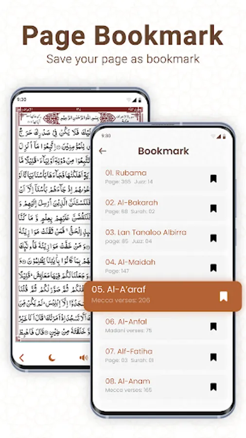 Holy Quran Pak : Quran Sharif All surah helps you to build bookmarks file. Save favorite reading surah or page with unlimited bookmarks القران المجيد can Add bookmarks to revise and reread Ayats, chapters, and Surahs. It can be arbitrary or orderly. For the direct reciting view of the chapter etc just click the bookmark icon and there will be all your mentioned bookmarks.