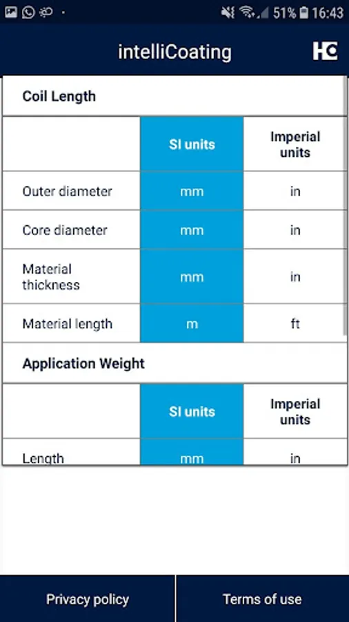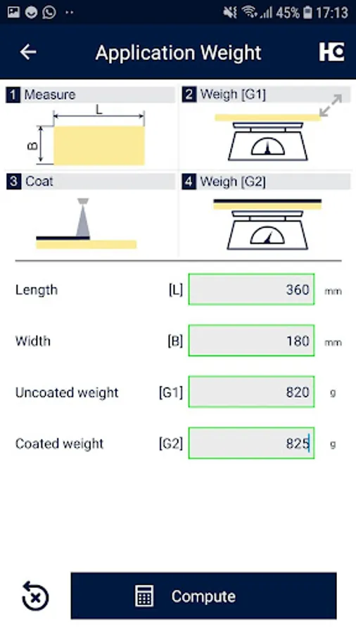 • By entering the work piece dimensions, the weight of the uncoated as well as the coated work piece, the app determines the applied application quantity.