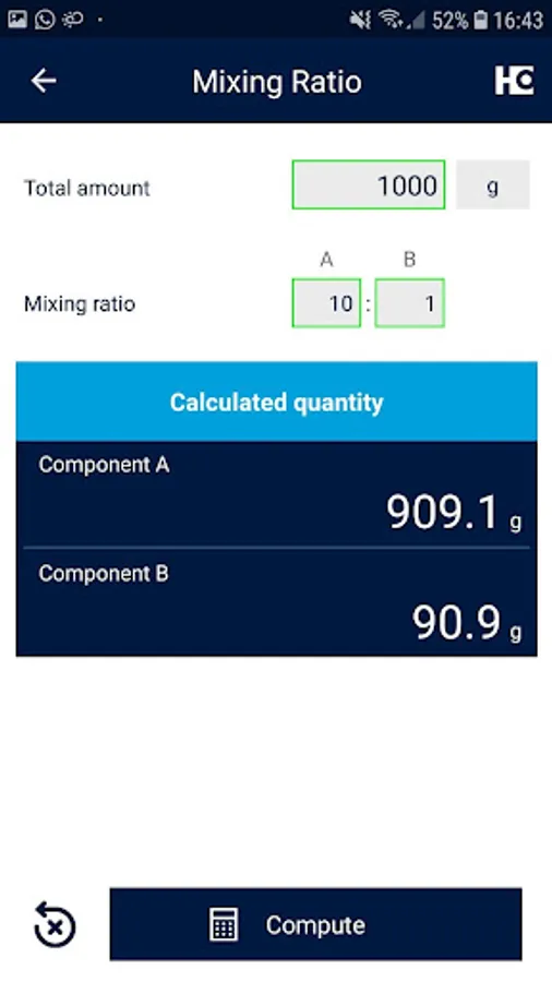 • The user only has to enter the required quantity of ready mixed coating material and the mixing ratio. The app will calculate exactly how much of each component to use.