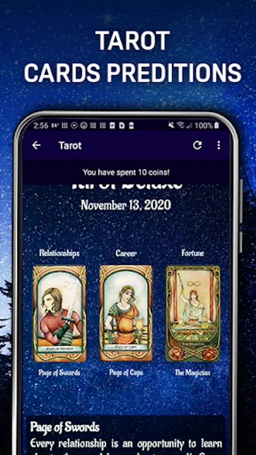Tarot Cards: Get inner wisdom and guidance from our Tarot Card feature. Get your daily 3 card reading and unlockable advanced spreads. Each card has a description of the meaning behind it.
