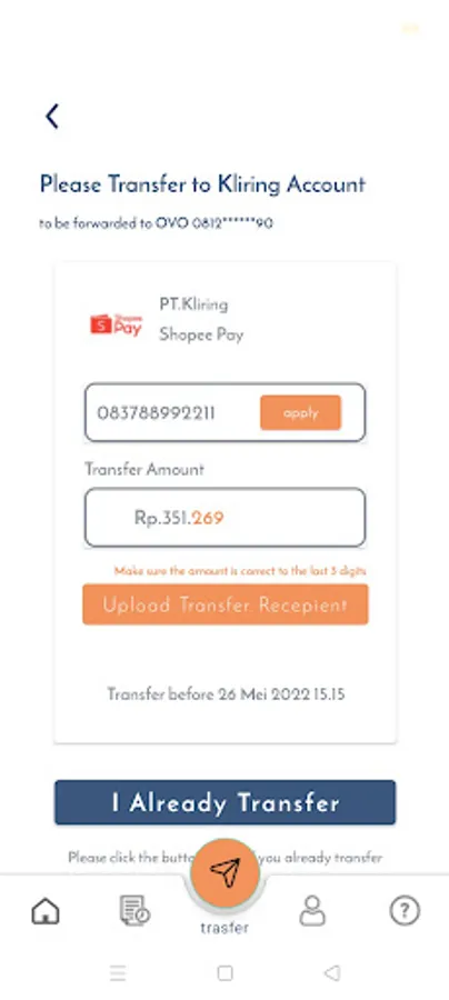 Clearing is a transaction application between digital wallets where this application consists of several features and transfer is the main feature in this application in this transfer feature the user can write down the name and choose the type of digital wallet and the nominal to be transferred after that the user will get the unique code, the next stage, the user must upload proof of the transfer, after that the proof of the transfer will be checked by the admin after it is deemed valid, a notification will appear that the application was successfully carried out in addition to the transfer feature this application is also accompanied by a history feature which in this feature displays transfer history is carried out, after that there is also a profile feature and a help feature that contains contacts that can be contacted if the user has problems using the application besides that there is also a notification feature that will bring up the latest notifications in the application.
