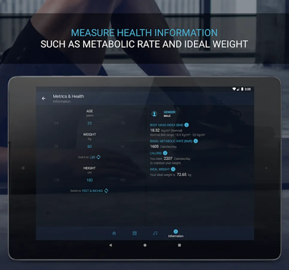 - Access health information such as the metabolic rate, mass index, and ideal weight