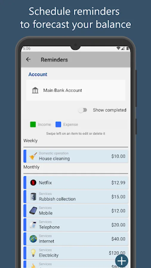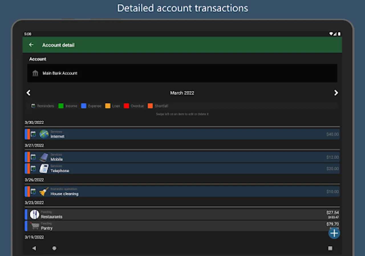 Set up the bills calendar easily and quickly by adding recurring transactions directly from the calendar. The payment status is indicated by the background color of the image, and is automatically updated based on existing monthly transactions.