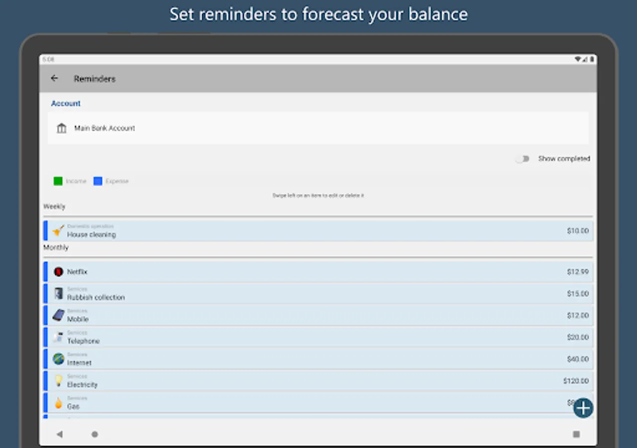 Homeasy is a great bill organizer that will help you to program your month transactions to avoid shortfalls.