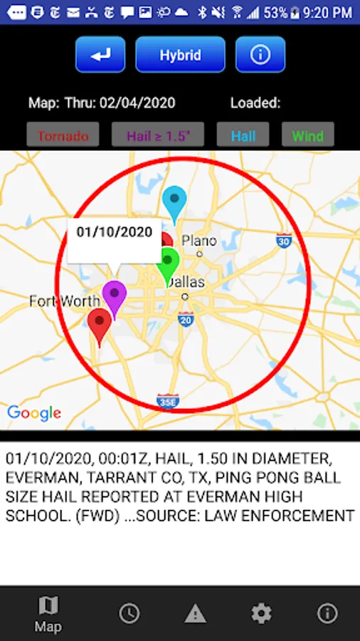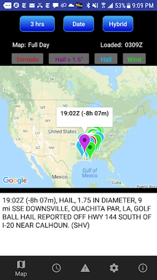 - Map of storm events with color coded markers. Timeframes are 3-hr, full day, or archival (back to 29 Feb 2004). Touch any pin for access to details.