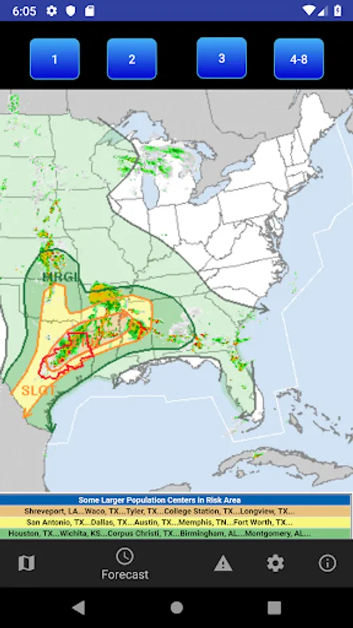 - 24 hour (with radar animation + watch boxes), 2-day, 3-day, and 4-8 day convective (thunderstorm) outlook with probability maps and technical discussion.
