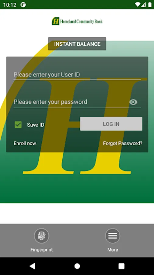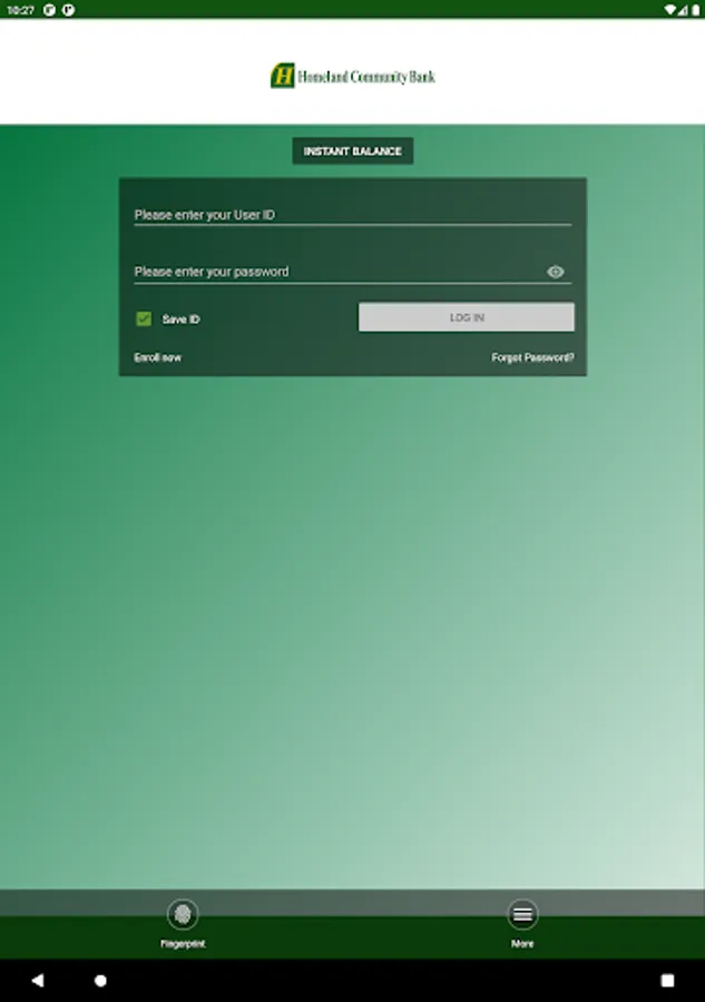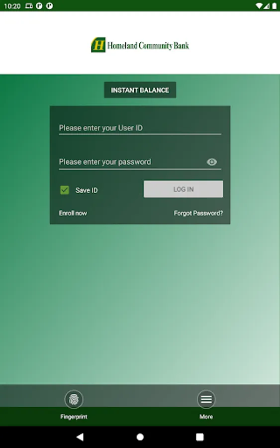 Homeland Community Bank Mobile App provides a FREE service that allows you to access your accounts anytime, from anywhere, using your Android device. There is no fee from Homeland Community Bank. Connectivity and usage rates may apply. Contact your wireless service provider for more details.
