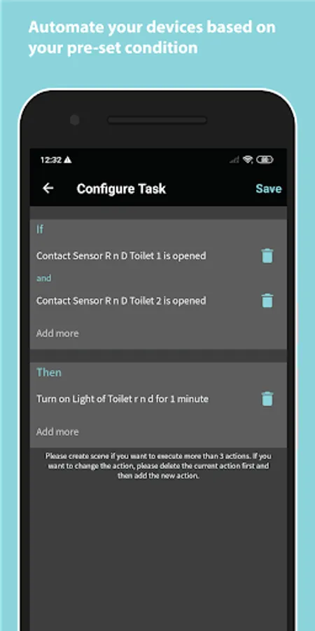Automate the device to do a certain actions based on the pre-set conditions. The condition is not just limited to device only but you can also set a general condition like day, date, time, timer & counter.