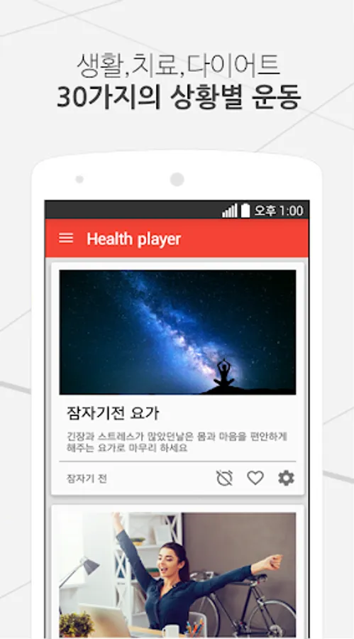 "Health Player is an app that helps users to easily follow exercises for 30 types of situations necessary for Koreans categorized per living, treatment, diet and health exercise.