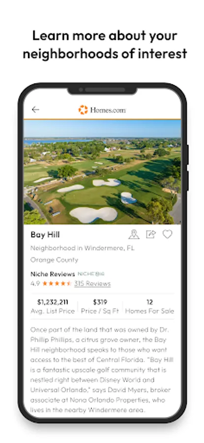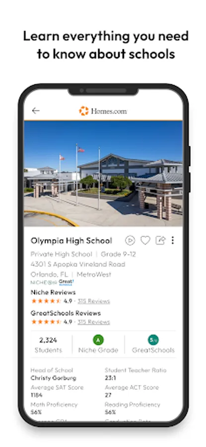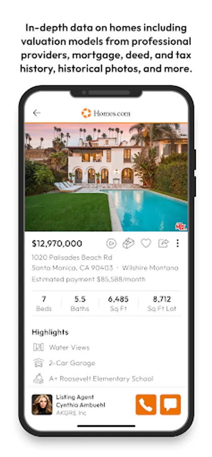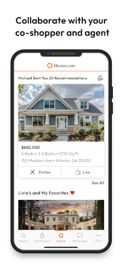 With the Homes.com app you’ll have access to homes for sale and rent, easy access to the listing agent’s contact information, the most detailed information about neighborhoods and schools, a robust directory to find qualified buyer agents specializing in your search, mortgage calculators, home value estimates from 4 sources, historical photos, and the most advanced collaboration tools around to easily co-shop with friends, family and the agent you choose to work with.