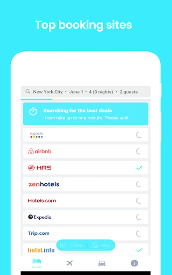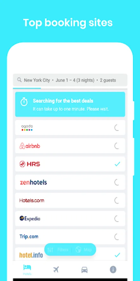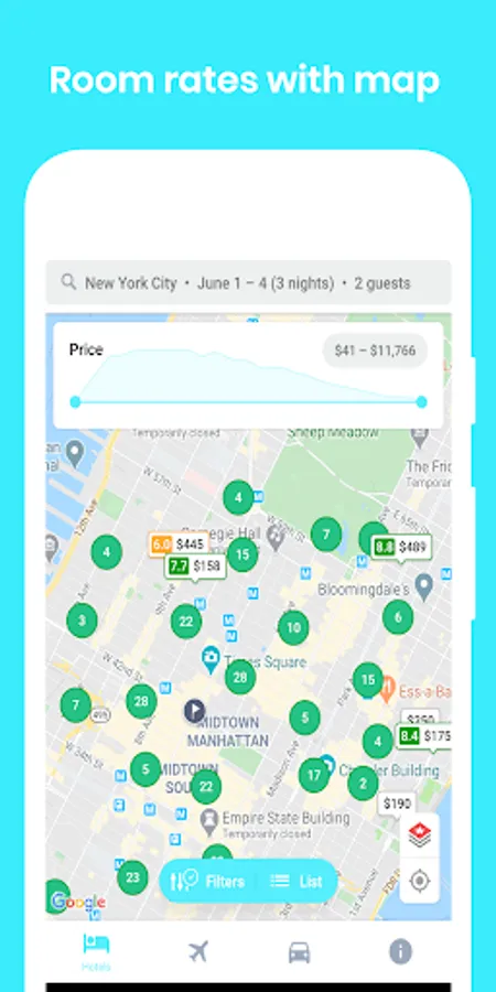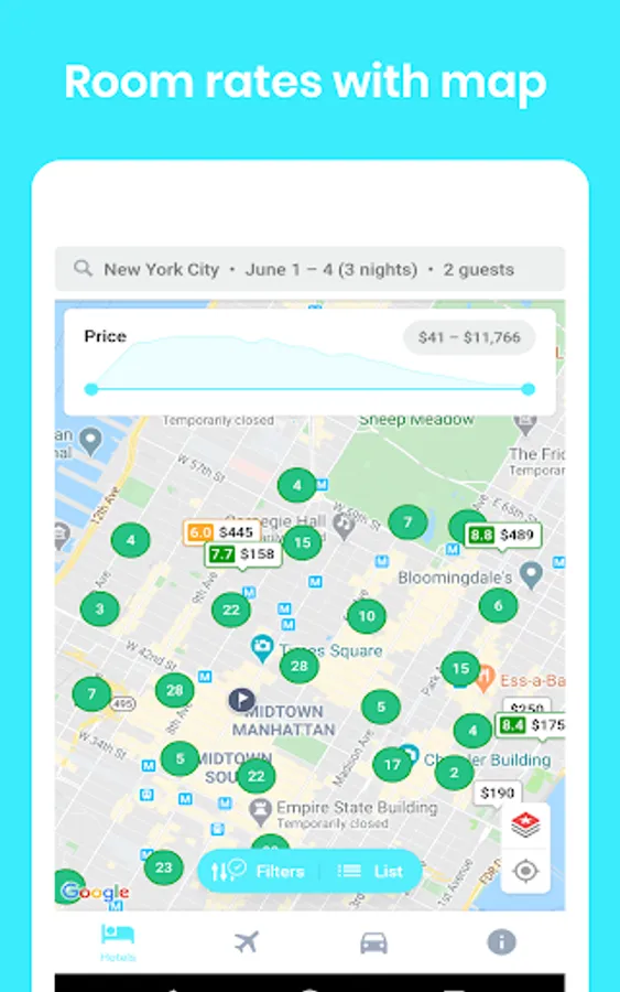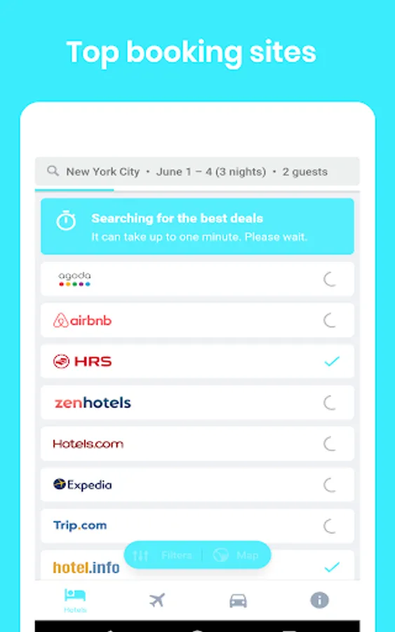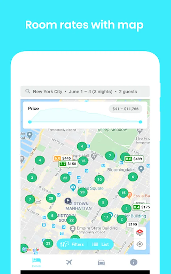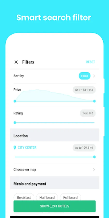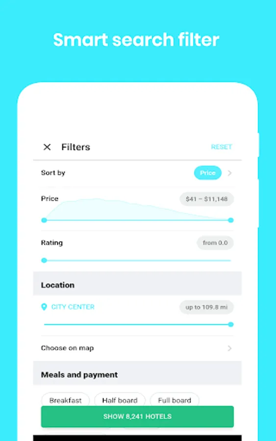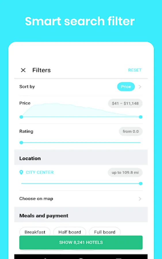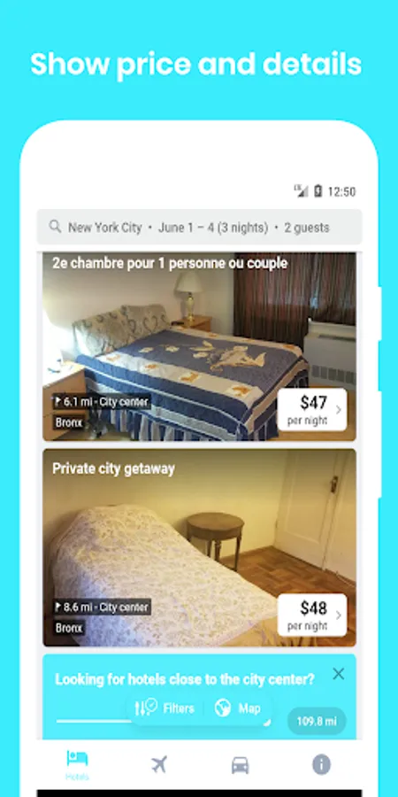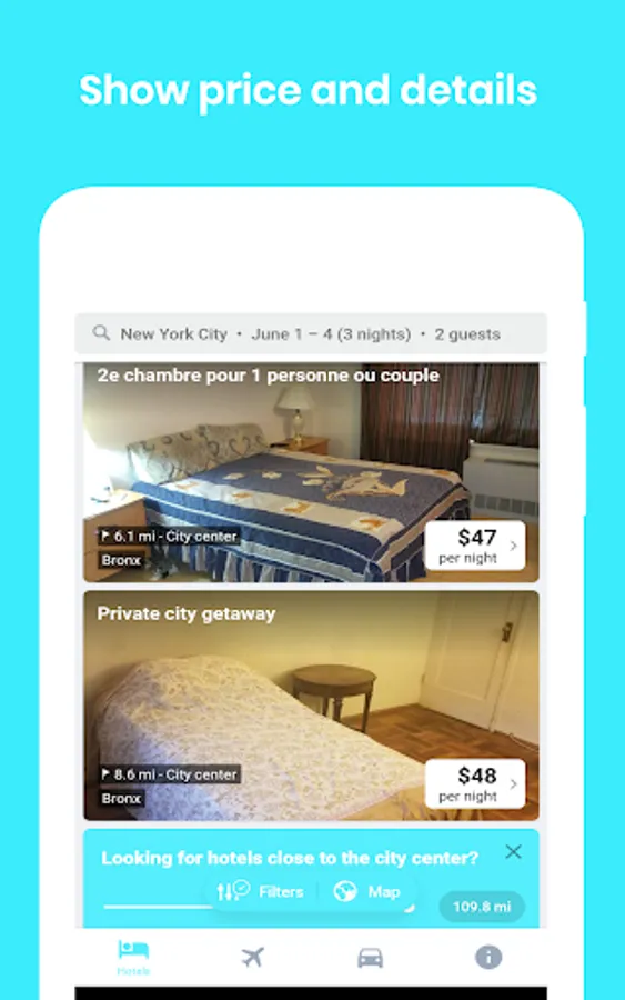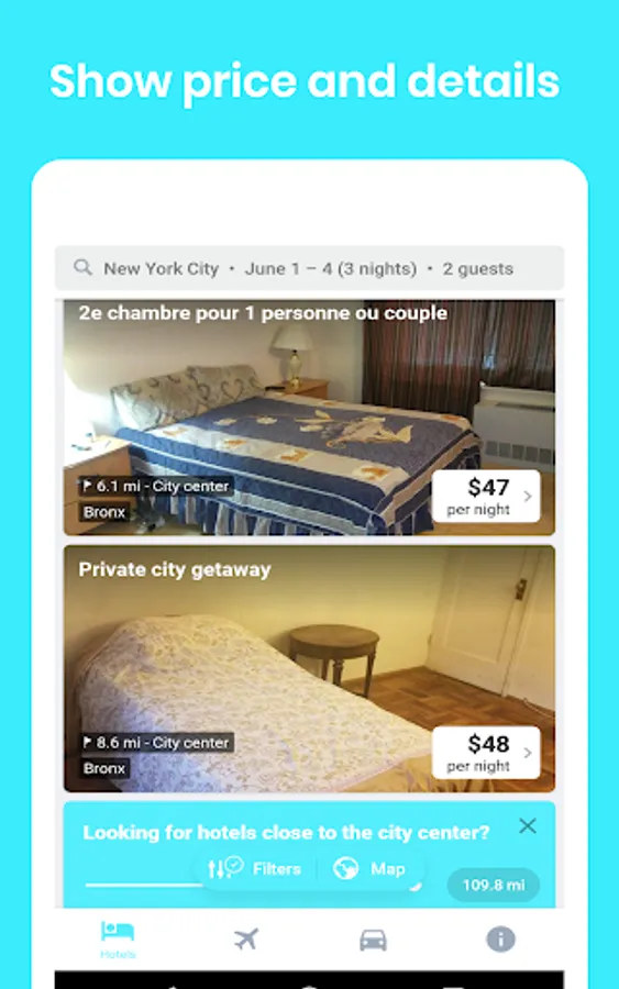 Booking: Enter city address, check-in and check-out date, number of people after which the app will find the latest offers that match your search
