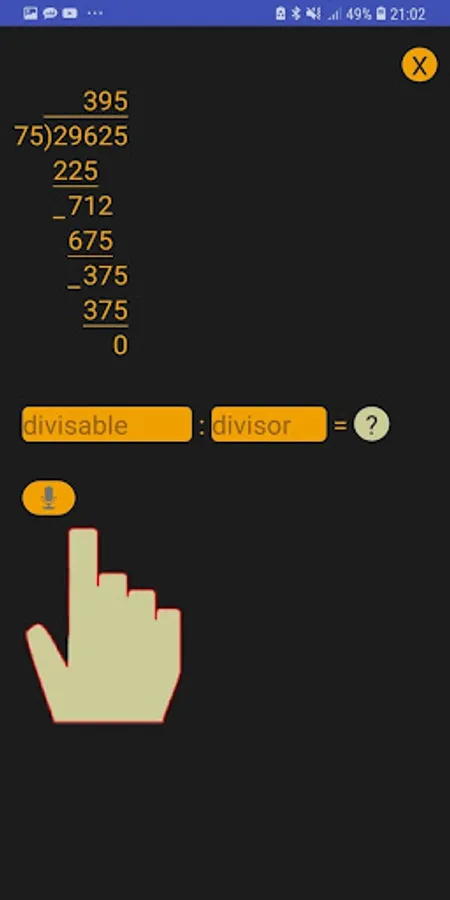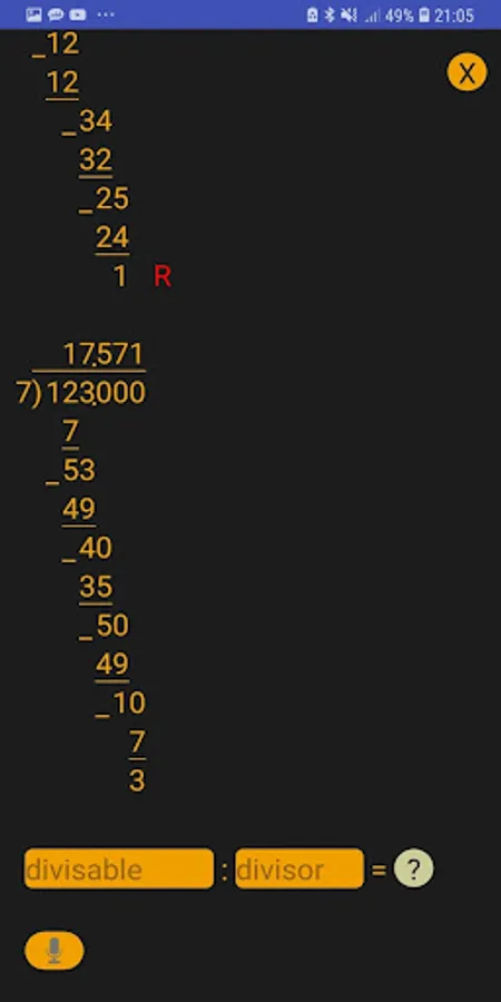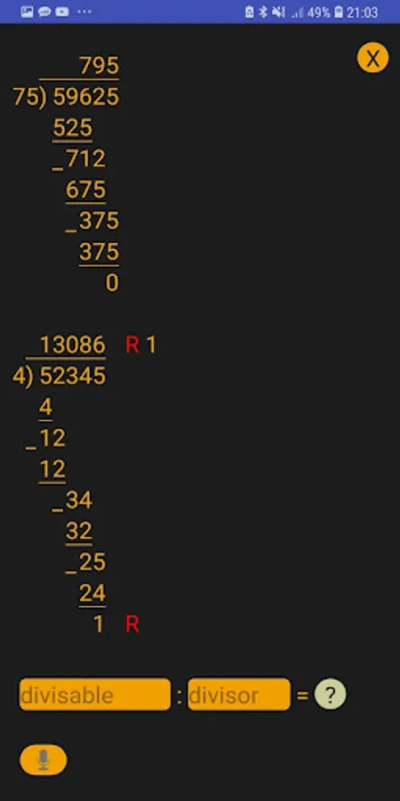 A simple and intuitive long division calculator with voice input. Recommended for everyone who is learning how to do long division. The app calculates long division of integers with remainder or with precision up to 0.00001.