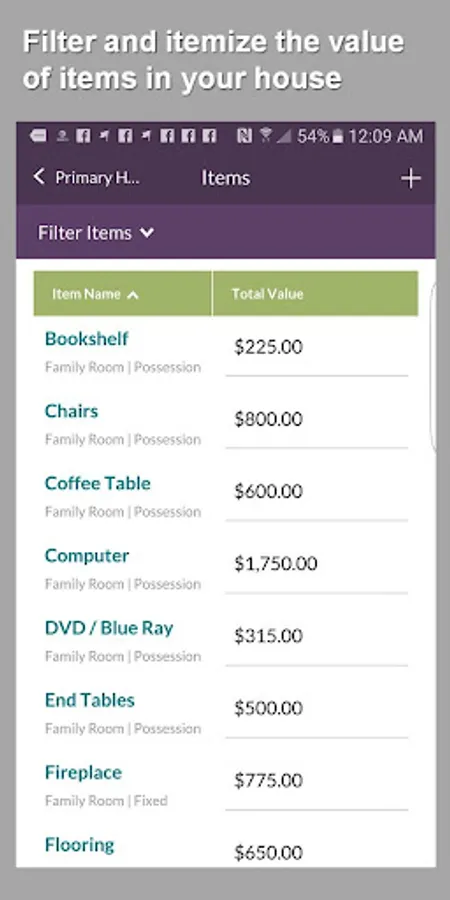 · Itemize an unlimited number of your home’s contents, such as electronics, furniture, collections etc.