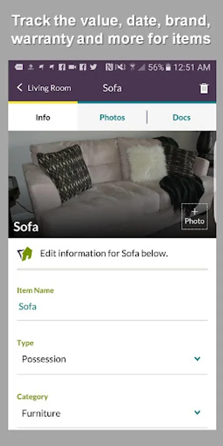 HomeZada is an easy to use home inventory app because it pre-populates all the Spaces and Items in your home which eliminates a lot of data entry. Just take photos and tag them to a Space or Item. You can navigate either room by room, or with a complete Item List that you can quickly edit and filter by any category.