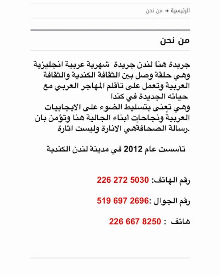 Hana London newspaper was founded in 2012, in the city of London, Ontario, it is published monthly in Arabic and English, and it is a link between Canadian culture and Arab culture, and works to adapt the Arab immigrant to his new life in Canada
