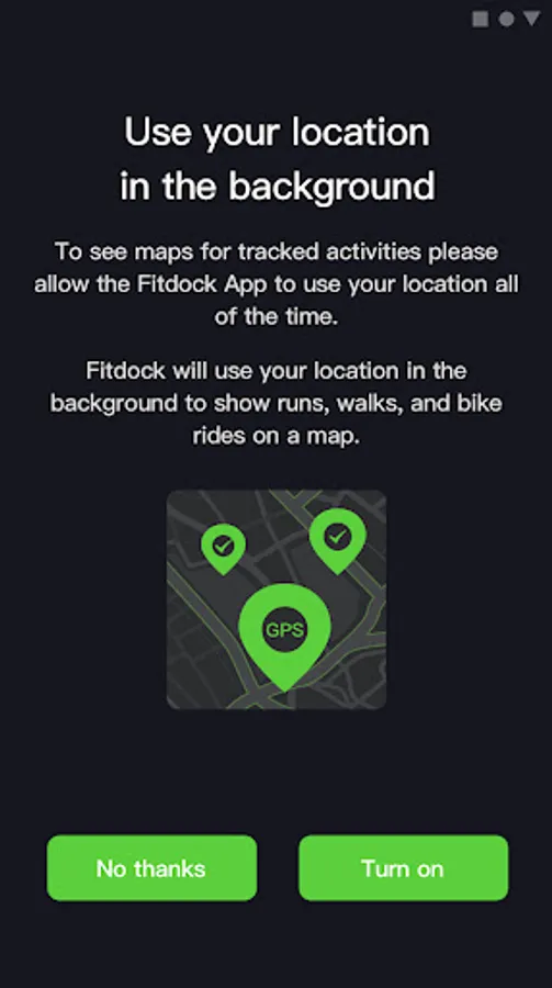 Please note: Fitdock will use your location in the background when you work out. It will draw a map of your activity and provide accurate exercise data.