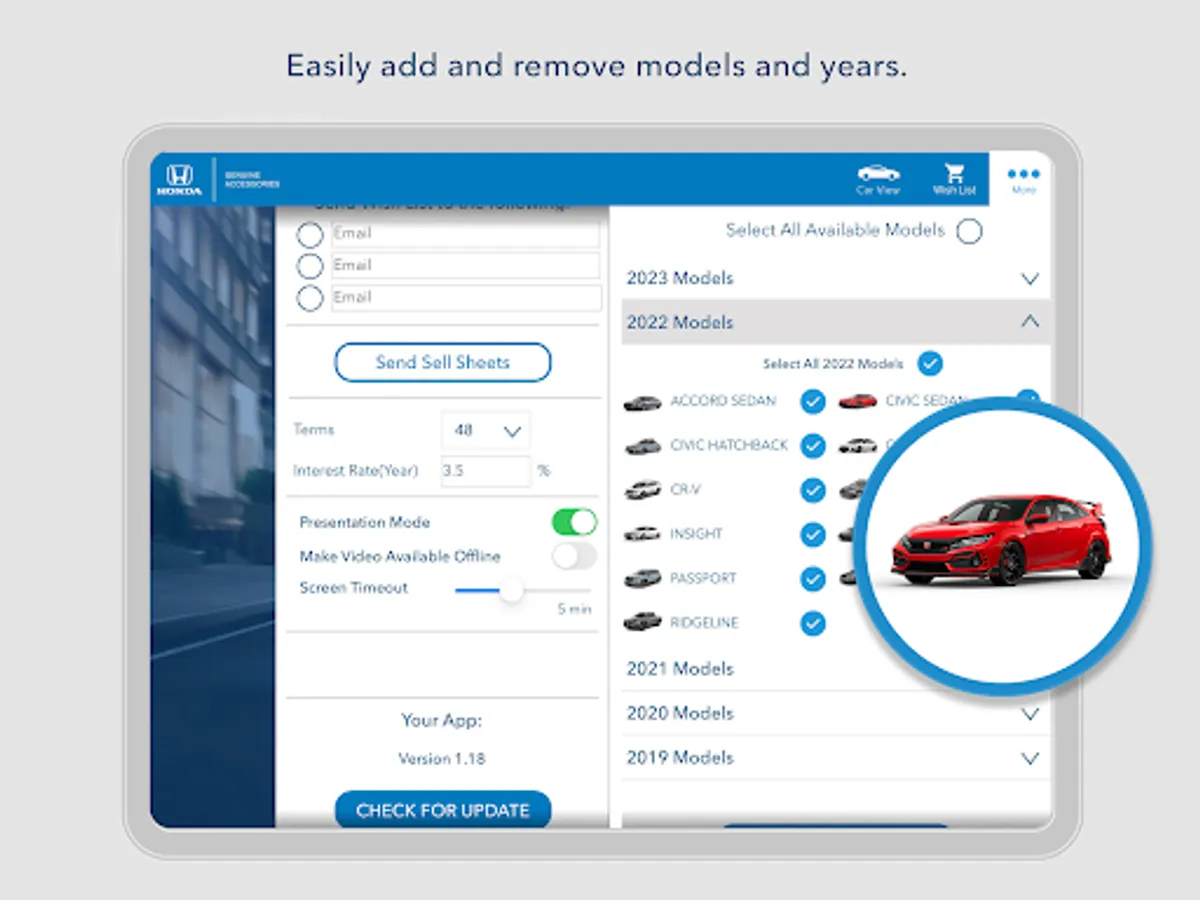 In the hands of the Dealer, the Honda Accessories App is a digital sell sheet with the power to help you move more accessories and increase revenue in your Sales and Service area.