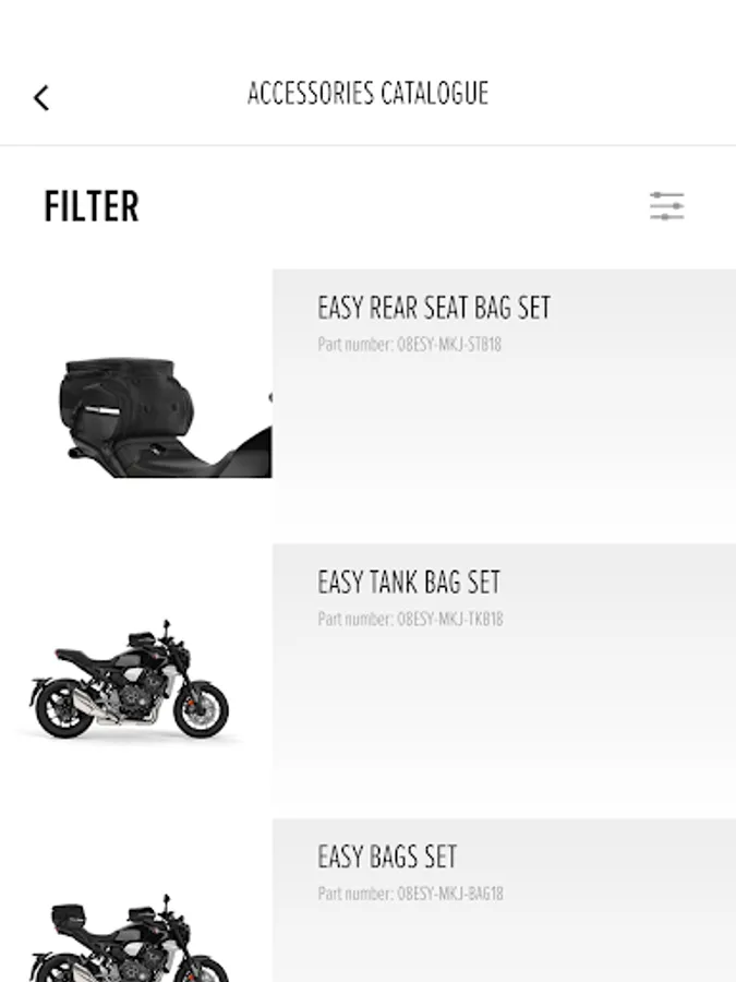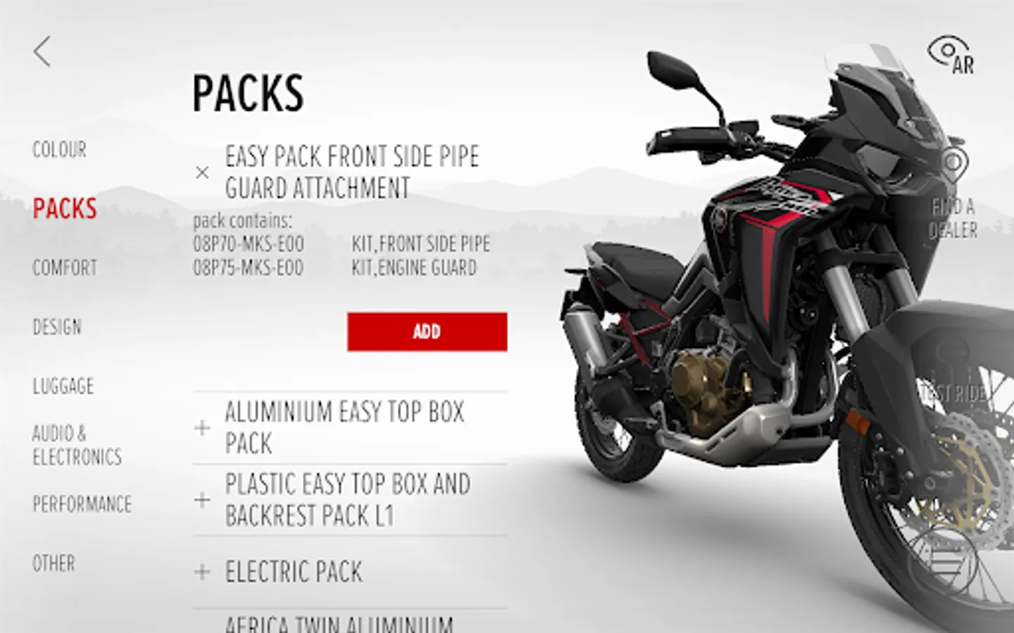 Play around with various configuration options of your 3D bike in a 360-degree view, and see it in your own environment with the Augmented Reality mode. Browse the newest video content, as well as the latest range of Honda genuine accessories in the newly built-in catalogue. Make sure to take photos and share them with your friends on social media.