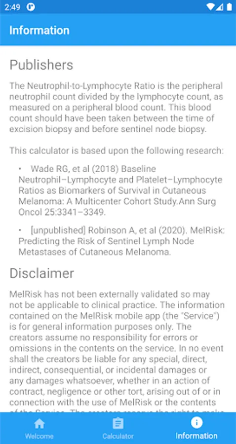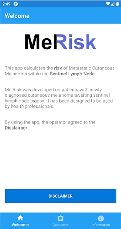 MelRisk has not been externally validated so, at present, this app is intended for medical research purposes only. It was designed for health care professionals, specifically experts in the management of cutaneous melanoma. MelRisk should not be used by members of the public without the advice of an adequately trained doctor.