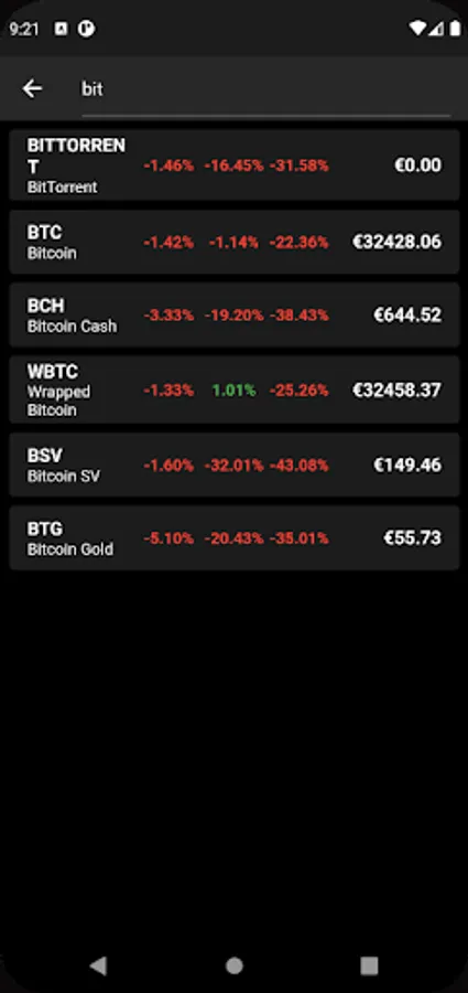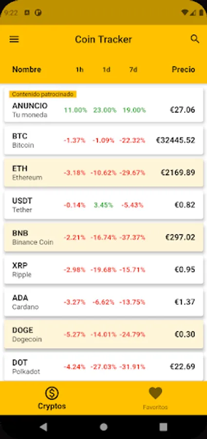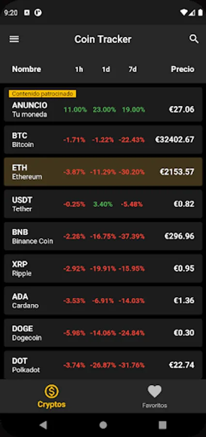With Coin Tracker you will be able to view the values of the most popular cryptocurrencies in real time, as well as save those that interest you the most in favorites to take a quick look at them.