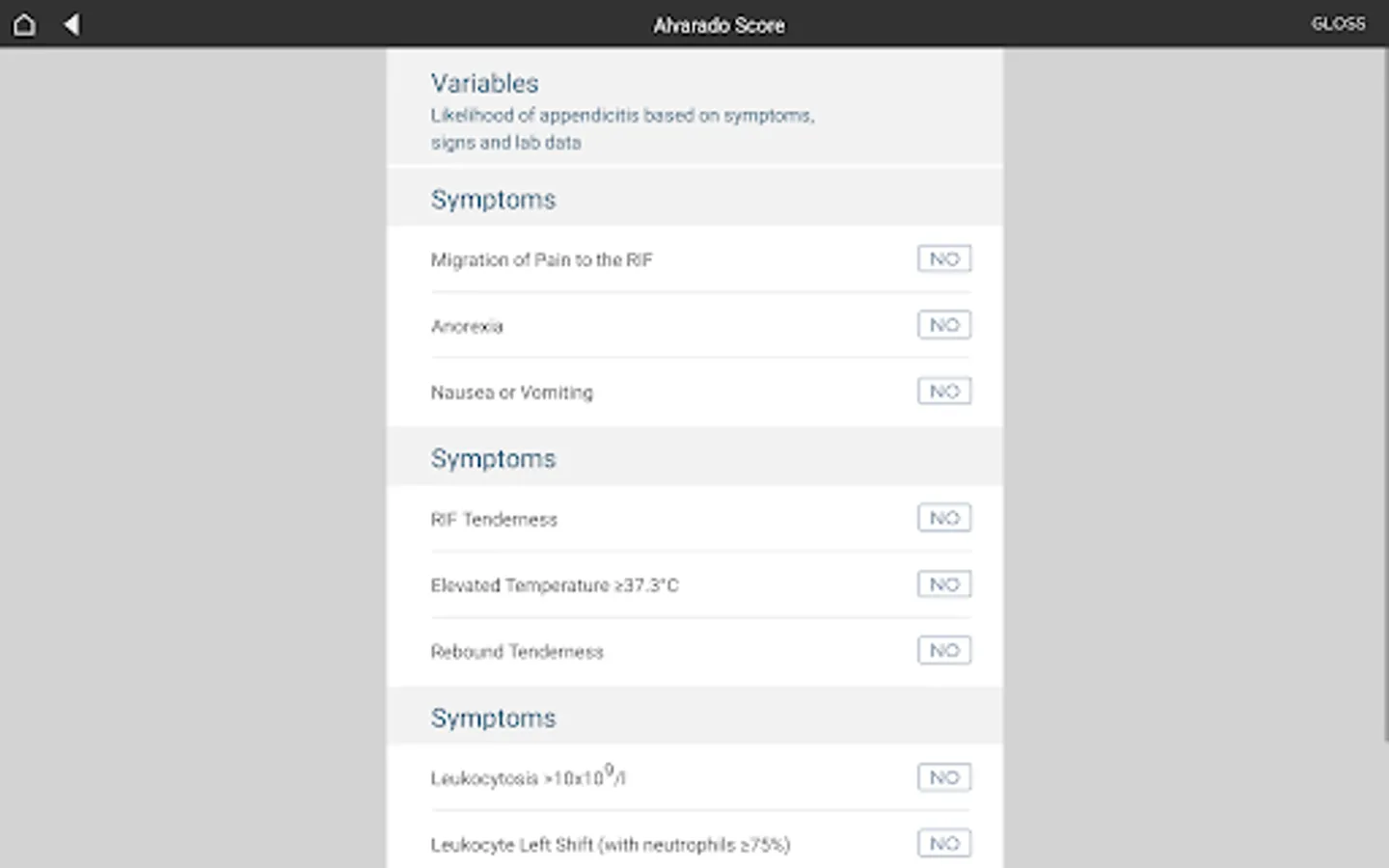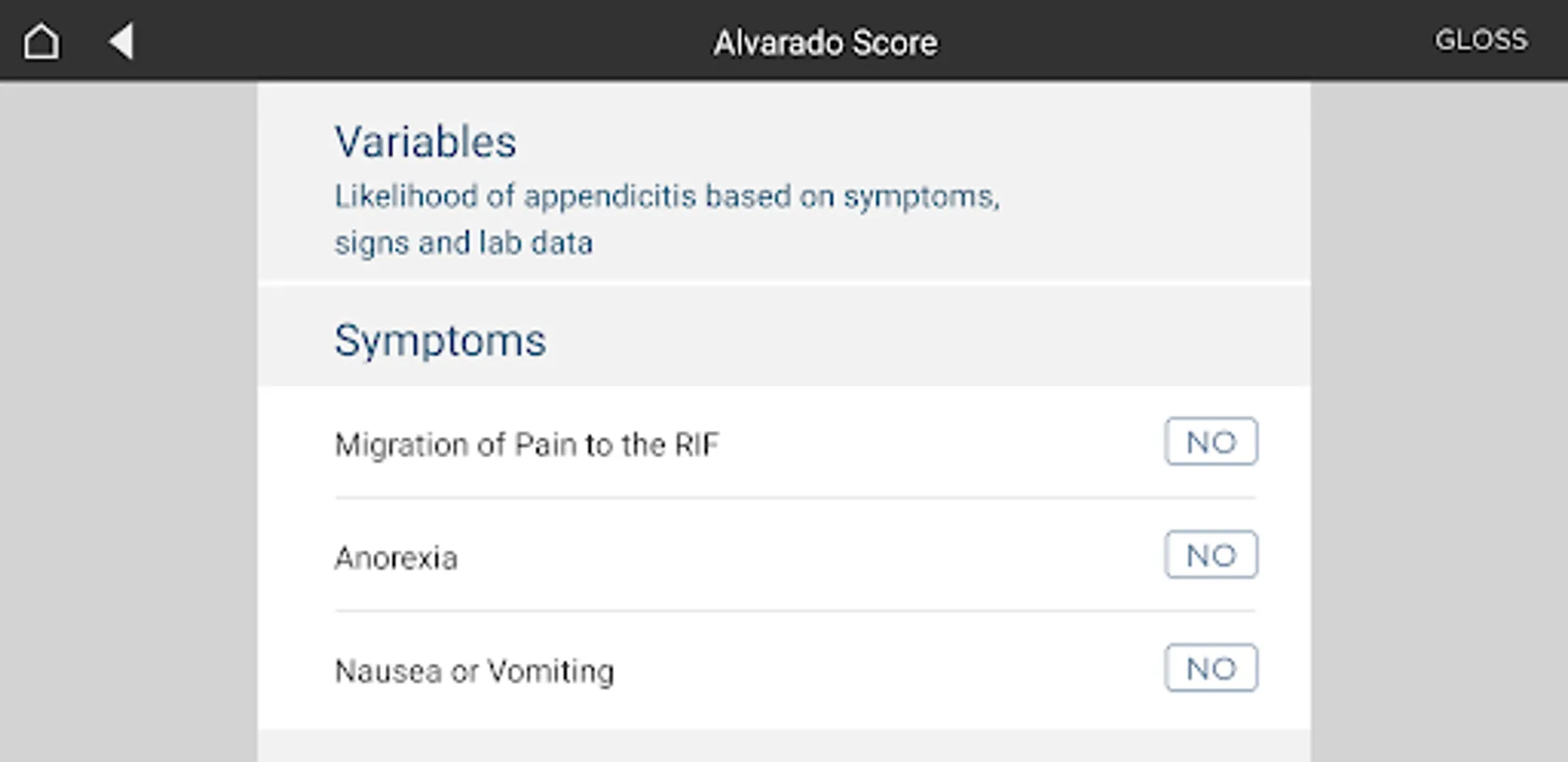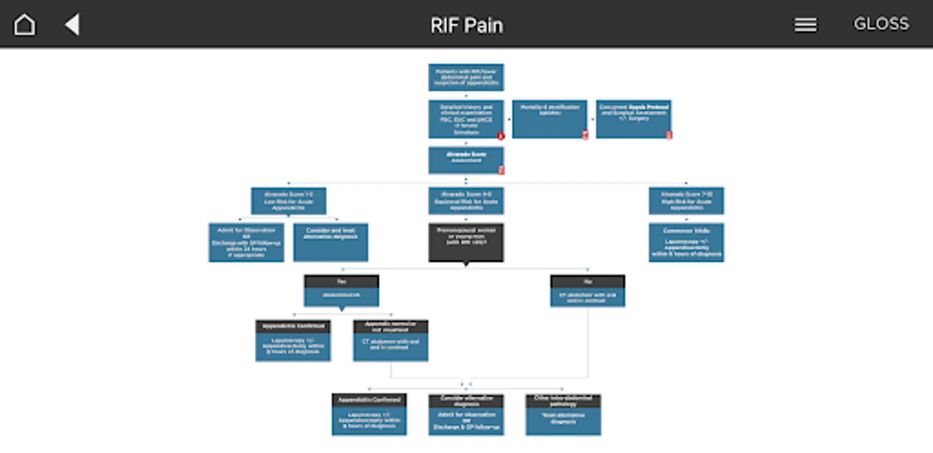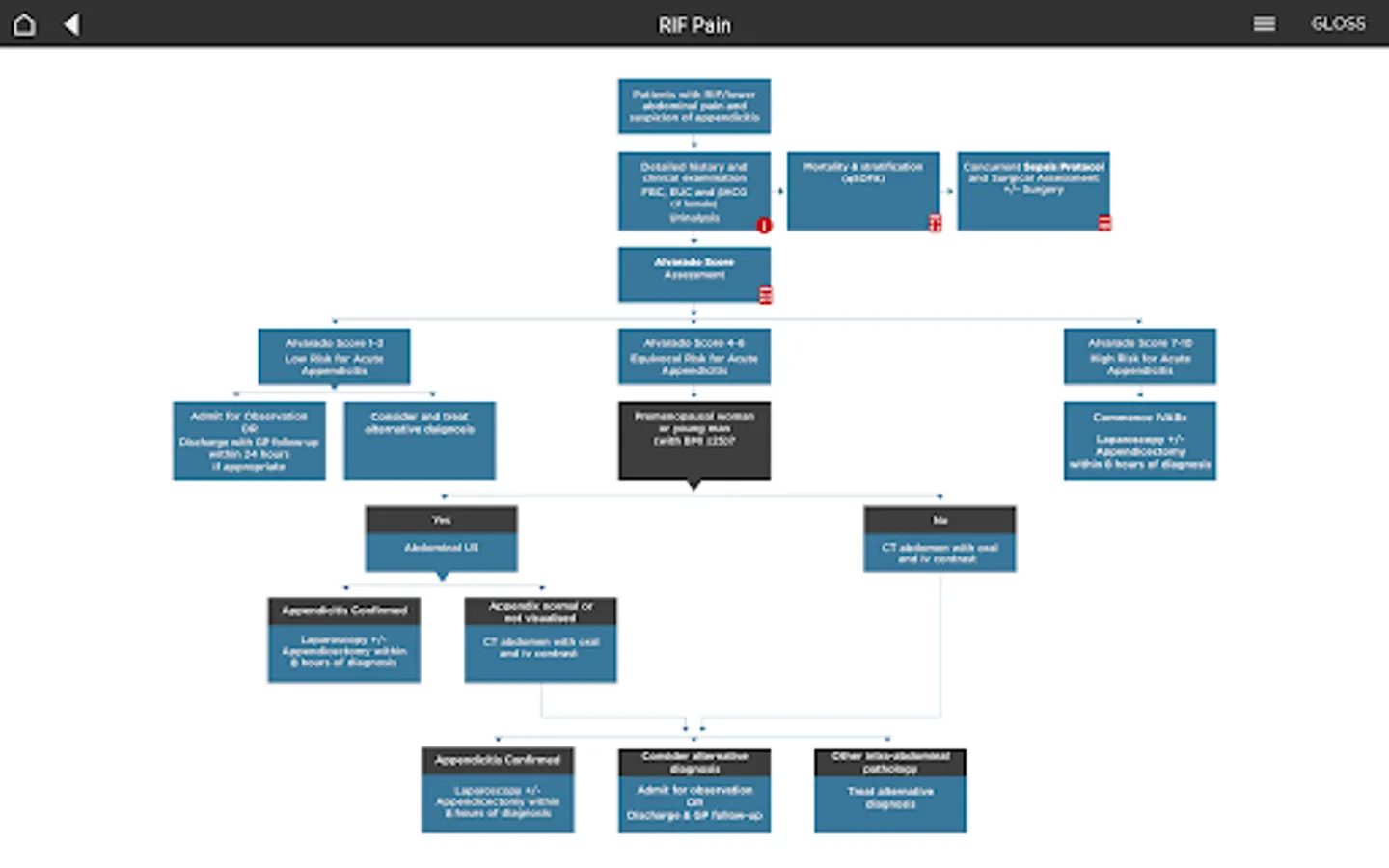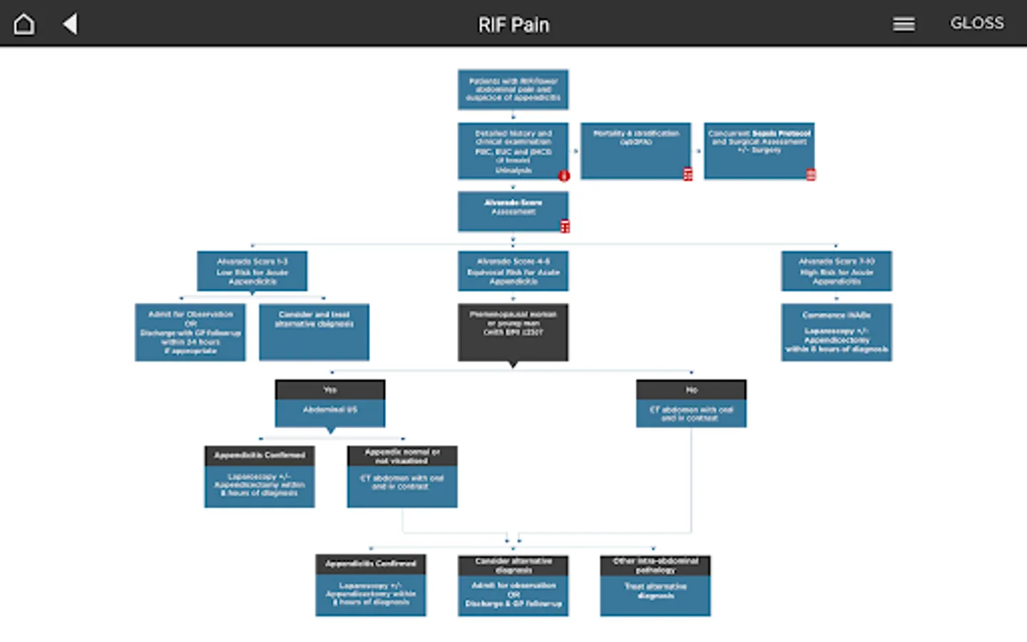 The algorithms, calculators and reference tables are evidence-based processes that are intended to assist medical doctors and patient decisions regarding the health care of acute general surgical patients at Westmead Hospital. Although designed to standardise decision plans for acute surgery, the algorithms cannot address the unique needs of each patient or the combination of resources available to a particular community or health care professional. The algorithms are not entirely inclusive or exclusive of all methods of reasonable care that can result in the same outcome. Deviation from these algorithms may be justified by individual circumstances. The use of these algorithms outside Westmead Hospital must be applied based on individual patient requirements using expert, professional judgment.