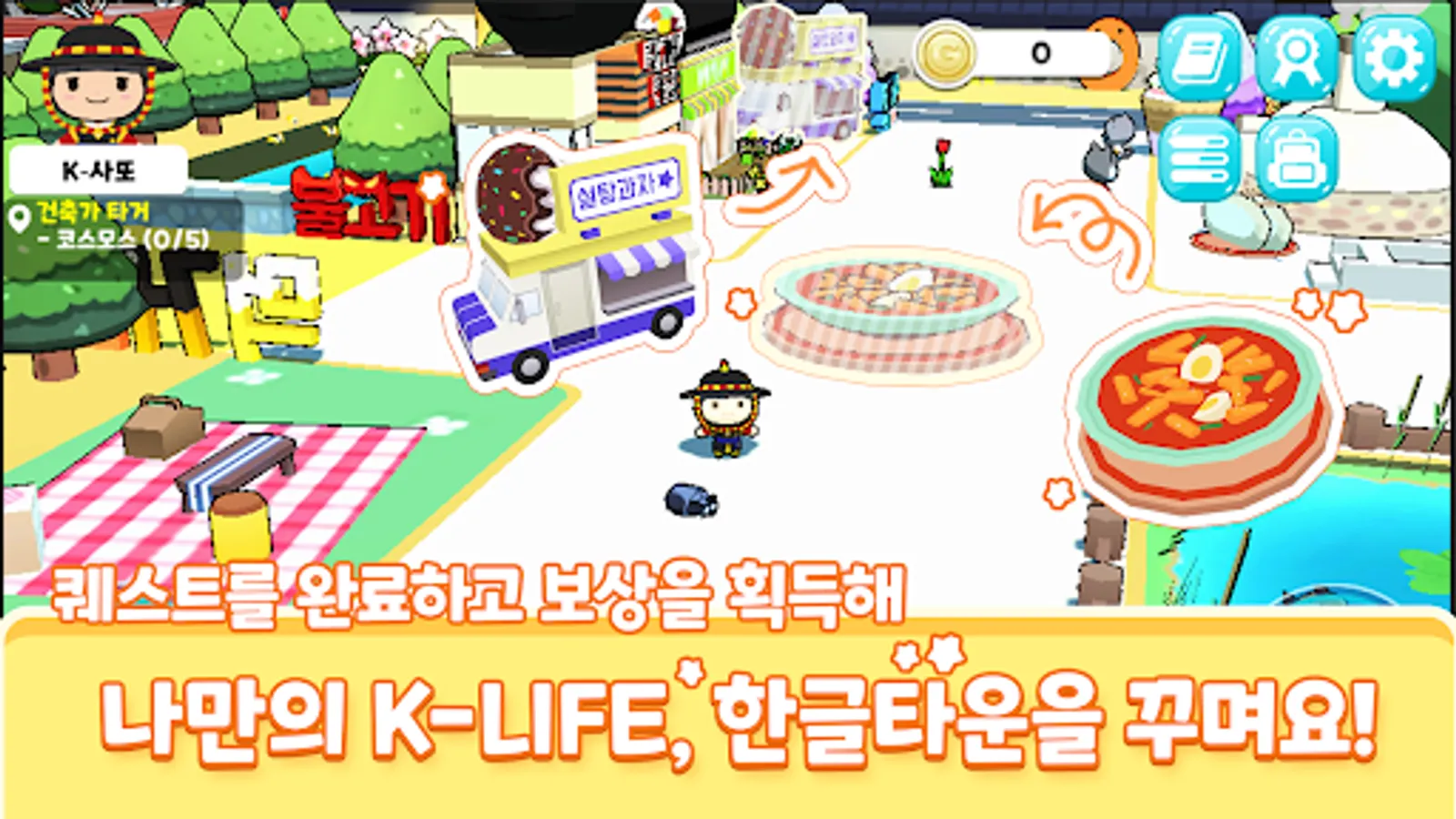 ▶ Complete quests and earn rewards to decorate your own Play Korea Town.