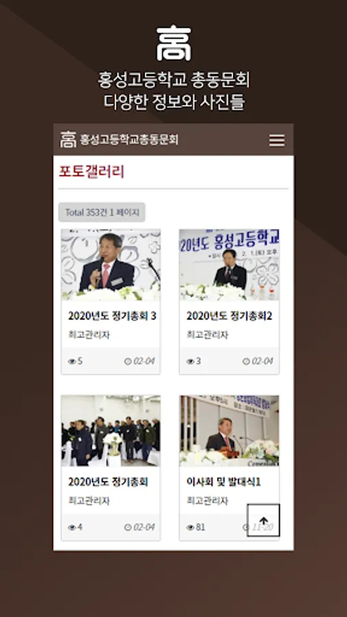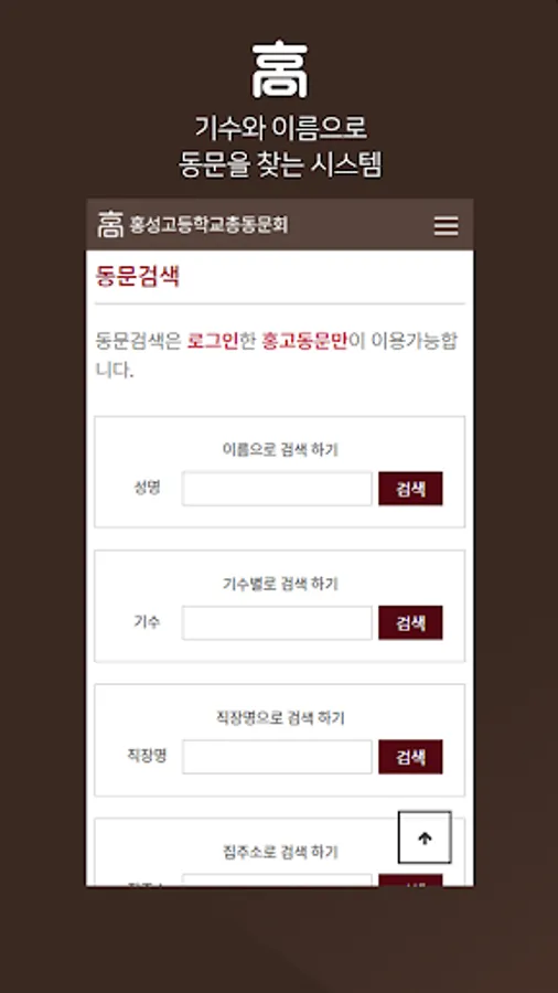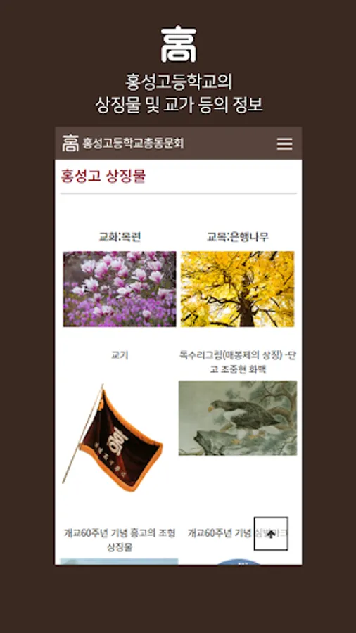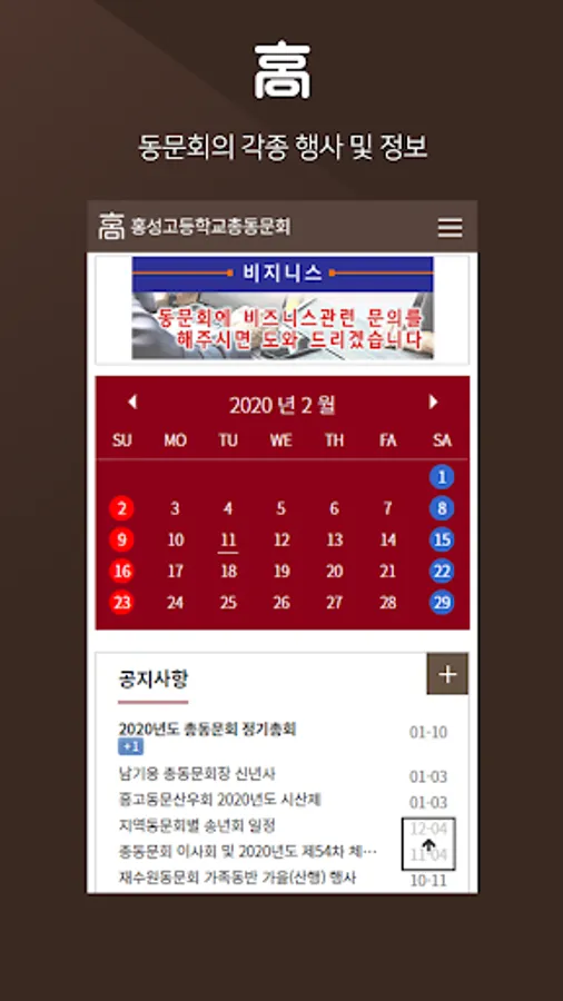 The Hongseong High School Alumni Association (www.honggo.com) provides services for information exchange and business activation between alumni. Alumni (person) business card, business information, alumni news, data room, etc. After registering, you can use after approval.