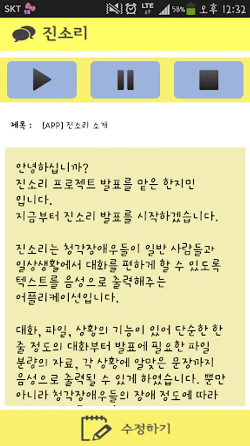 언어 장애인을 위해 텍스트를 음성으로 변경해주는 어플리케이션입니다.