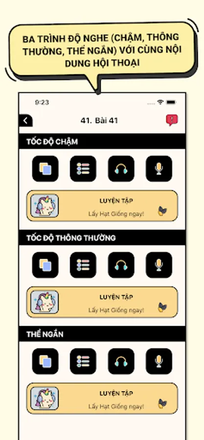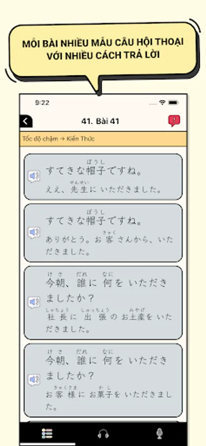 For each question, there will be 2 ways of answering, corresponding to 2 situations Yes and No, with 3 forms: slow speed with polite form, normal speed with polite form, fast speed with short sentences.