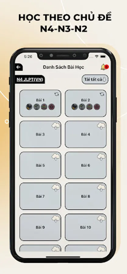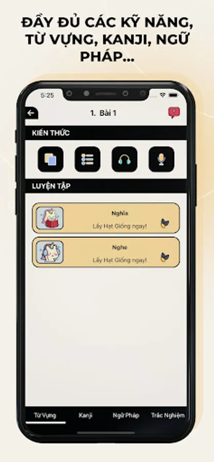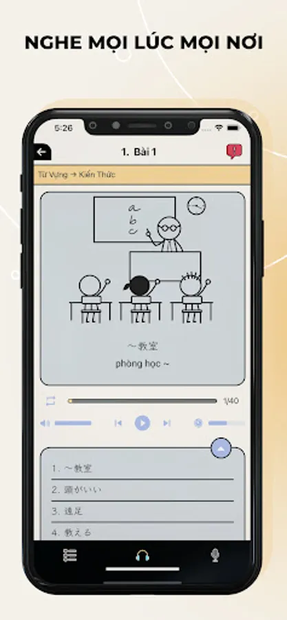 1. Basic knowledge of words and Kanjis: In each unit, you can check the audio, characters and meanings. (N4 words have illustrations)