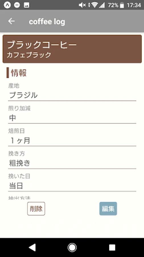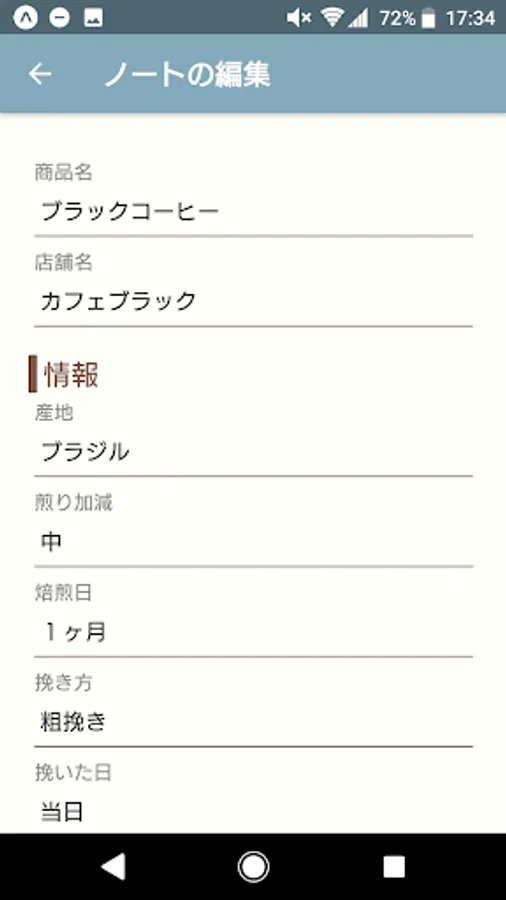 商品名/店舗名/産地/煎り加減/焙煎日/挽き方/挽いた日/抽出方法/飲み方/値段/味/香りなどの情報を記録することができるノートアプリです。
