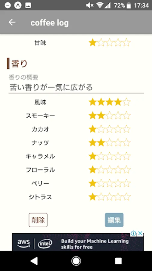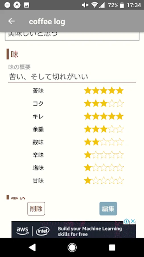 味や香りの感想に加えて、豆の情報や挽いた日焙煎日などの情報も記録できます。