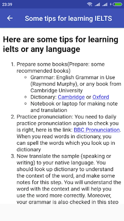 IELTS Preparation For Exam: Free provides samples that content each IELTS Preparation For Exam app including Reading, listening, writing and Speaking skills all represented in the sample contents and tips or tricks to solve test lesson.
