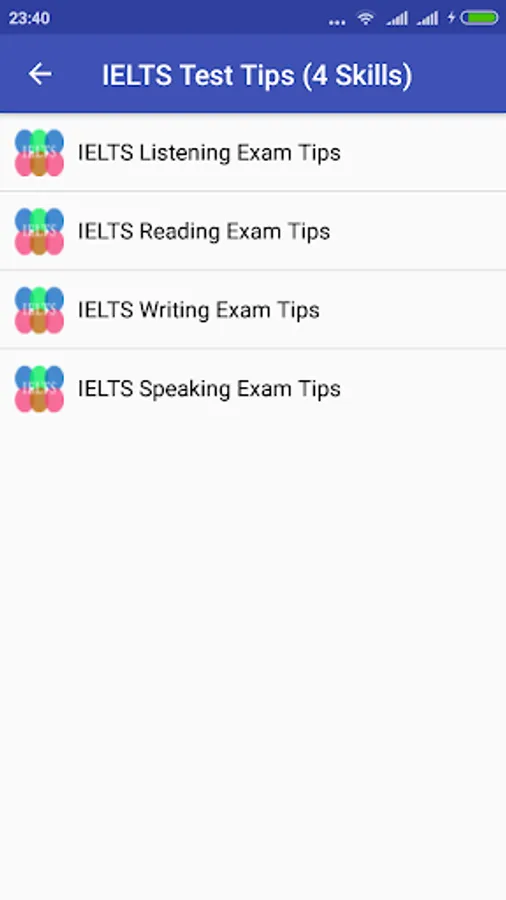IELTS Preparation For Exam app including 4 main parts standing for each typical skill: