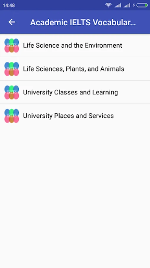 IELTS Preparation- Vocabulary Guide app including 4 main parts standing for each typical skill:
