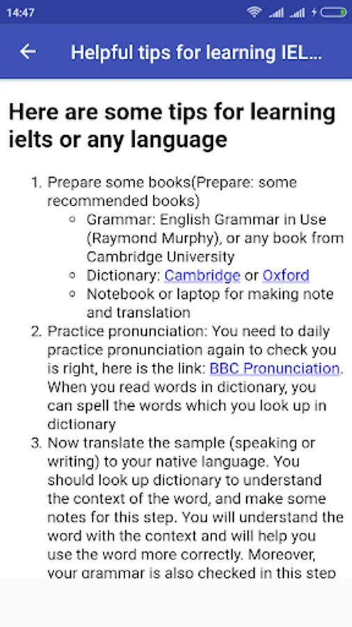 The IELTS Preparation- Vocabulary Guide app provides helpful tips, examples to practice exercises and interactive lessons to help you improve capabilities in addressing and resolving at each typical task. By following tips and practicing diligently you will gain expected score at IELTS test.