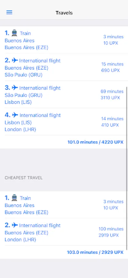 - Choose departure and arrival cities, then the fastest (less time) and cheapest (less UPX to spend) routes will be displayed.
